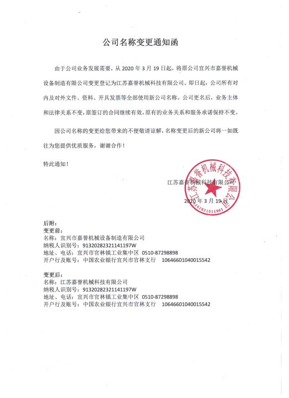 宜興嘉譽機械設備制造有限公司企業名稱變更通知